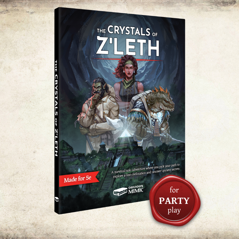 Based on the popular solo adventure of the same name, The Crystals of Z’leth party adventure gives 4 to 6 second-level characters a chance to explore a corrupted jungle, the remains of a long-lost empire, and an ancient evil as old and deadly as time itself.