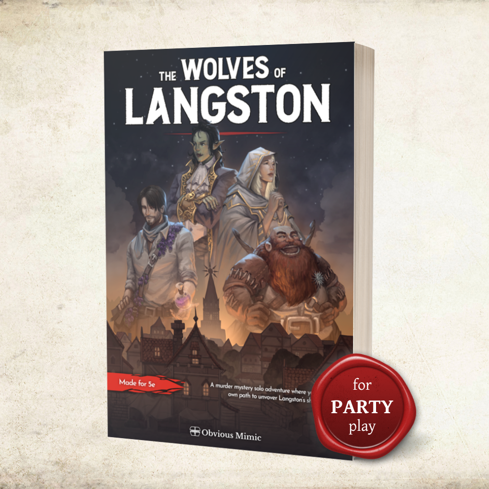 The Wolves of Langston party adventure tells the same story as the solo adventure but is designed as a playable one-shot or multi-session module for a DM to run for a full party of player characters. Includes more lore, stats, and scaling for different-sized parties at levels 1 to 4.
